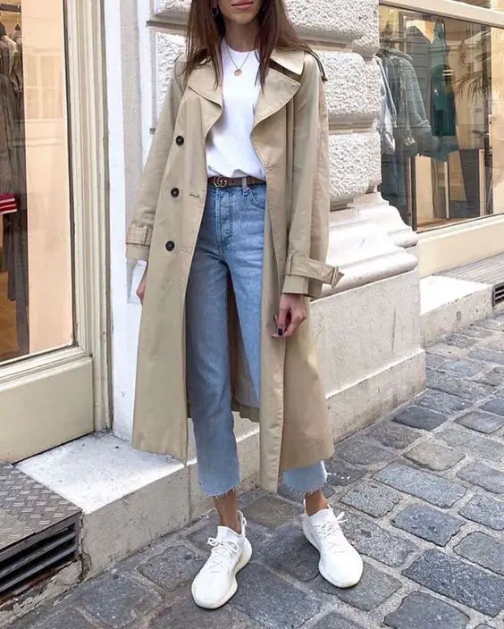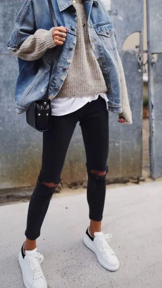 Los suéteres anchos y jeans son las prendas casuales más cómodas de otoño para combinar con tenis blancos. ¡No hay falla! Lleva hjeans claro sde preferencia y busca un suéter ultra largo que te haga sentir calientita.